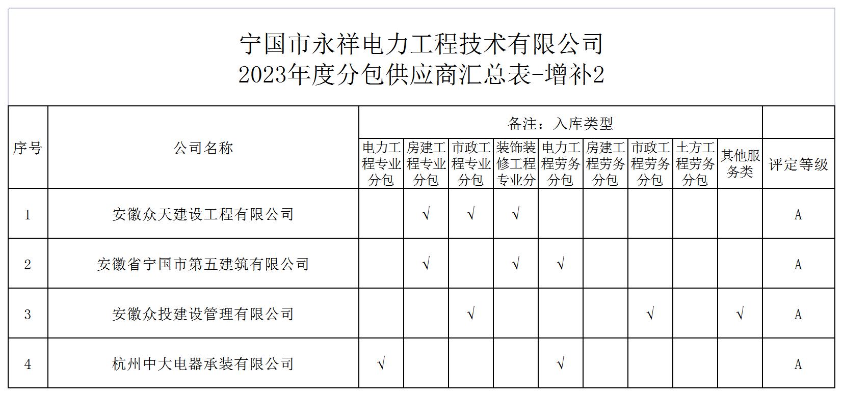 宁国市永祥电力工程技术有限公司2023年度供应商库入围增补以下单位,现将入围的候选人予以公示。